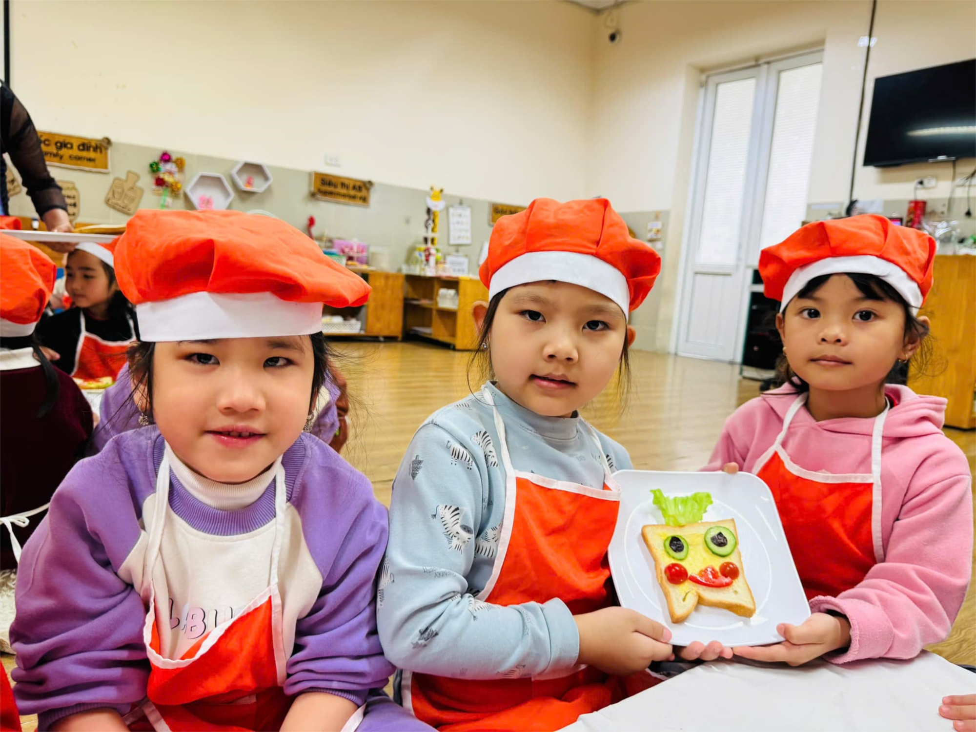 Trong tiết học STEAM của lớp MGL A5, các bạn nhỏ đã biến lát bánh mì sandwich thành những khuôn mặt rạng rỡ bằng những nguyên liệu quen thuộc như rau xanh, bơ , cà chua… Một chút khéo léo, một chút sáng tạo, và bé đã có ngay một “bánh mì hạnh phúc” độc nhất vô nhị!