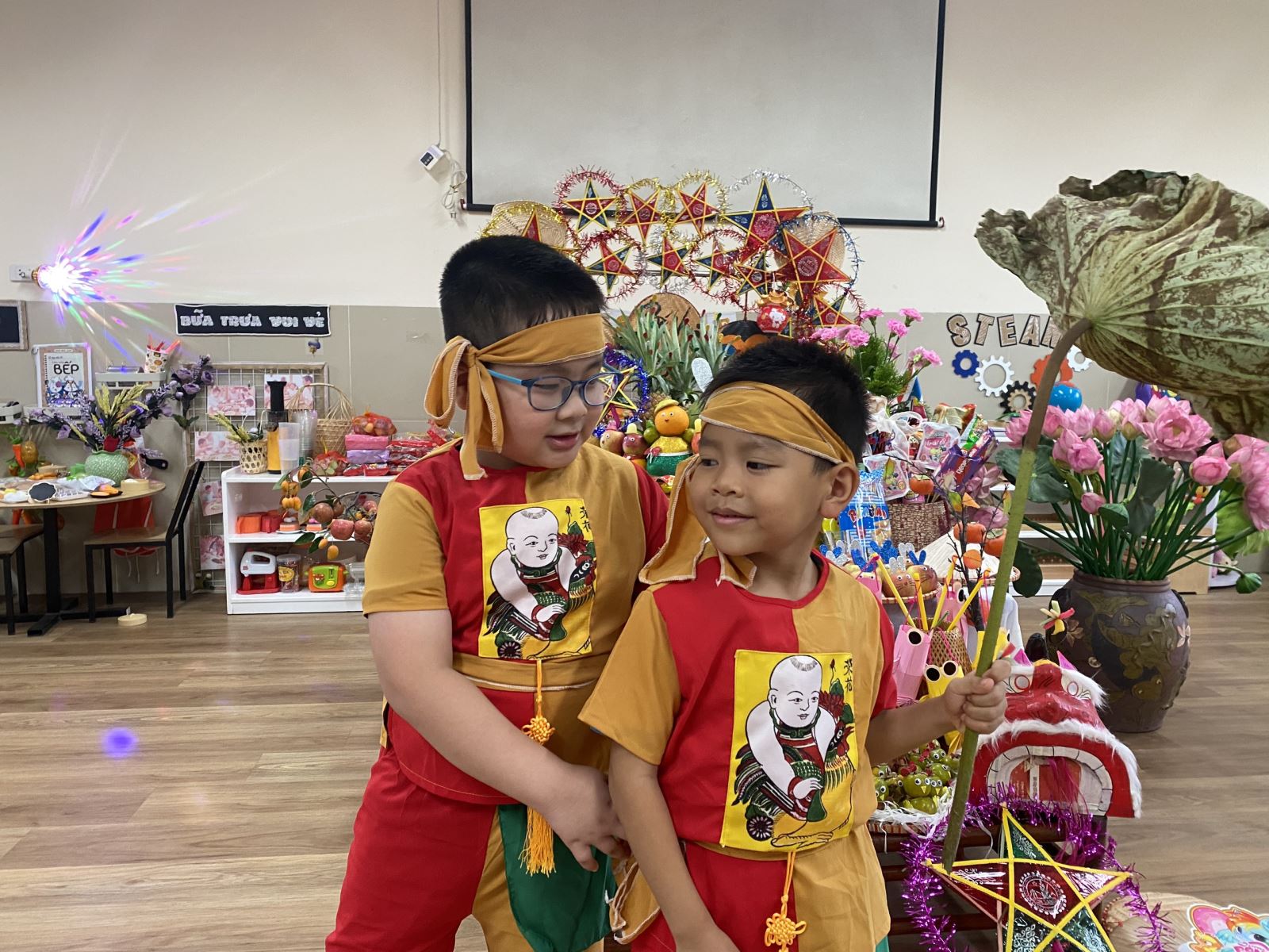 Hòa chung trong không khí tưng bừng phấn khởi của Thiếu nhi cả nước chào đón “Tết trung thu”, khắp các nẻo đường, con phố cùng niềm vui hân hoan của tuổi thơ.Tết trung thu, mùa của những sắc màu rực rỡ, mùa của những mùi hương, mùi hoa, hòa quện trong không khí háo hức vui mừng đón Tết trung thu của các bạn nhỏ lớp Mẫu giáo lớn A1. Hàng năm, cứ mỗi dịp trung thu lại đến, từ các ngõ nghách thôn quê đều nhộn nhịp trong không khí tổ chức và chuẩn bị trung thu. Thật vui thay khi các em nhỏ được Bố, Mẹ sắm cho các bé những chiếc đèn lồng rực rỡ, trẻ em thì tưng bừng hát ca “Phá cỗ cùng chị Hằng- Chú Cuội”. Trong không khí háo hức đó, cô và trò lớp mẫu giáo lớn A1 đã có những hoạt động ý nghĩa giúp các con có những ngày trung thu đặc biệt khó quên đó chính hoạt động trang trí lớp với những chiếc đèn lồng sáng tạo hay cùng cô quây quần bên mâm ngũ quả để cùng lưu lại những khoảnh khắc tuyệt vời của các con. Sau đây là 1 số hình ảnh của