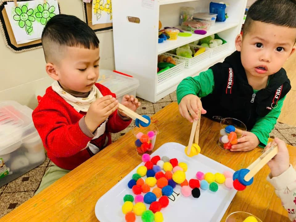 Các bé lớp nhà trẻ D1 rèn luyện kỹ năng vận động tinh qua trò chơi gắp