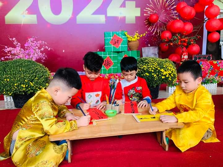 Hãy Cùng các bạn lớp A4 trải nghiệm làm quen với cách viết chữ thư pháp từ bút lông với mực màu đã được pha sẵn. Đây là hoạt động được tổ chức với hình thức “học mà chơi - chơi mà học” để giúp trẻ hiểu hơn về cách viết chữ Thư Pháp, qua đó giáo dục tình yêu tiếng Việt cho trẻ