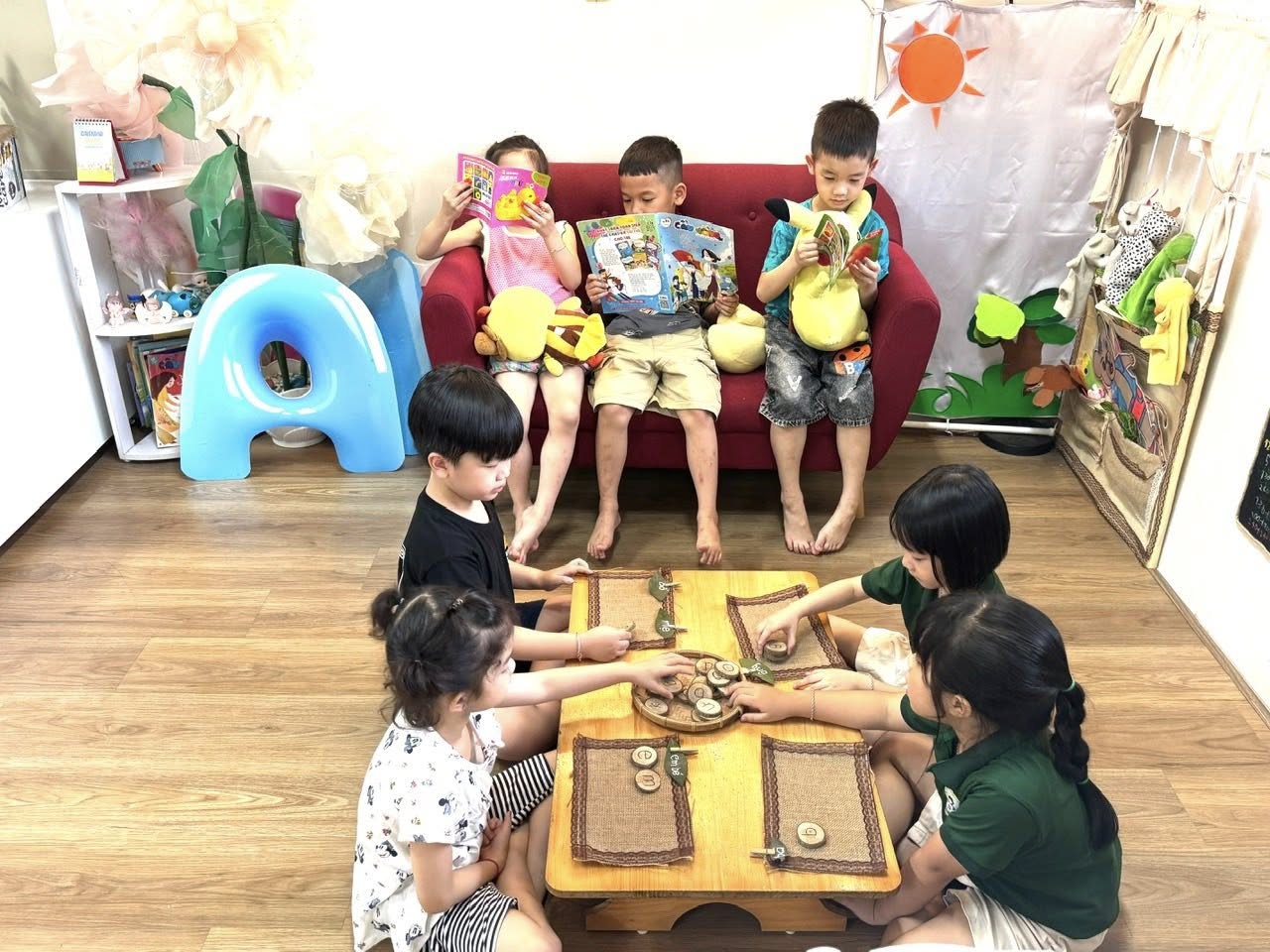 Tại góc ngôn ngữ, các bé được xem sách truyện sinh động, tự tay ghép chữ cái bằng những nguyên vật liệu rời đầy màu sắc – vừa học chữ, vừa rèn luyện tư duy logic và sự khéo léo.