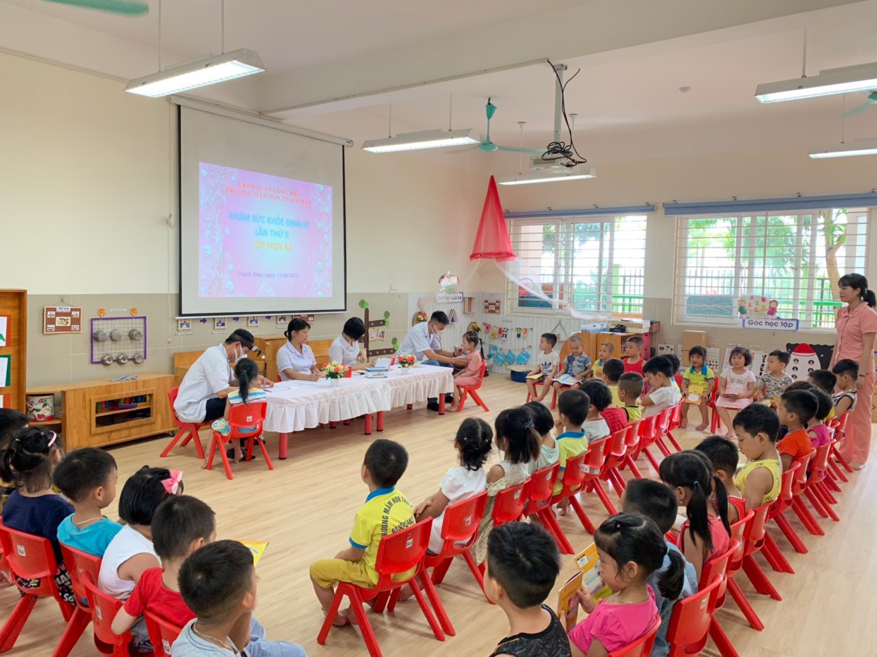 Sáng ngày 11,12/6/2020 Trường Mầm non Thạch Bàn đã kết hợp với Trạm Y tế phường Thạch Bàn tổ chức khám sức khỏe định kỳ lần 2 năm học 2019 - 2020 cho trẻ, với sự tham gia đầy đủ các bác sĩ, y tá của Trạm. Các y bác sỹ đã khám cho trẻ từ độ tuổi 2 tuổi đến độ tuổi 5 tuổi. Mỗi đợt khám sức khỏe tại trường, trẻ sẽ được kiểm tra các chỉ số: cân nặng, chiều cao, khám mắt, tai – mũi – họng, răng – hàm – mặt, kiểm tra tim phổi, dinh dưỡng.