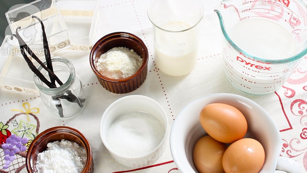 – Trứng gà tách lấy lòng đỏ, đánh đều cho đến khi mịn. Cho đường, bột bắp, sữa bột vào đánh tan. Sau khi sữa đã được đun nóng bạn đổ từ từ vào hỗn hợp trứng gà và đánh đều.