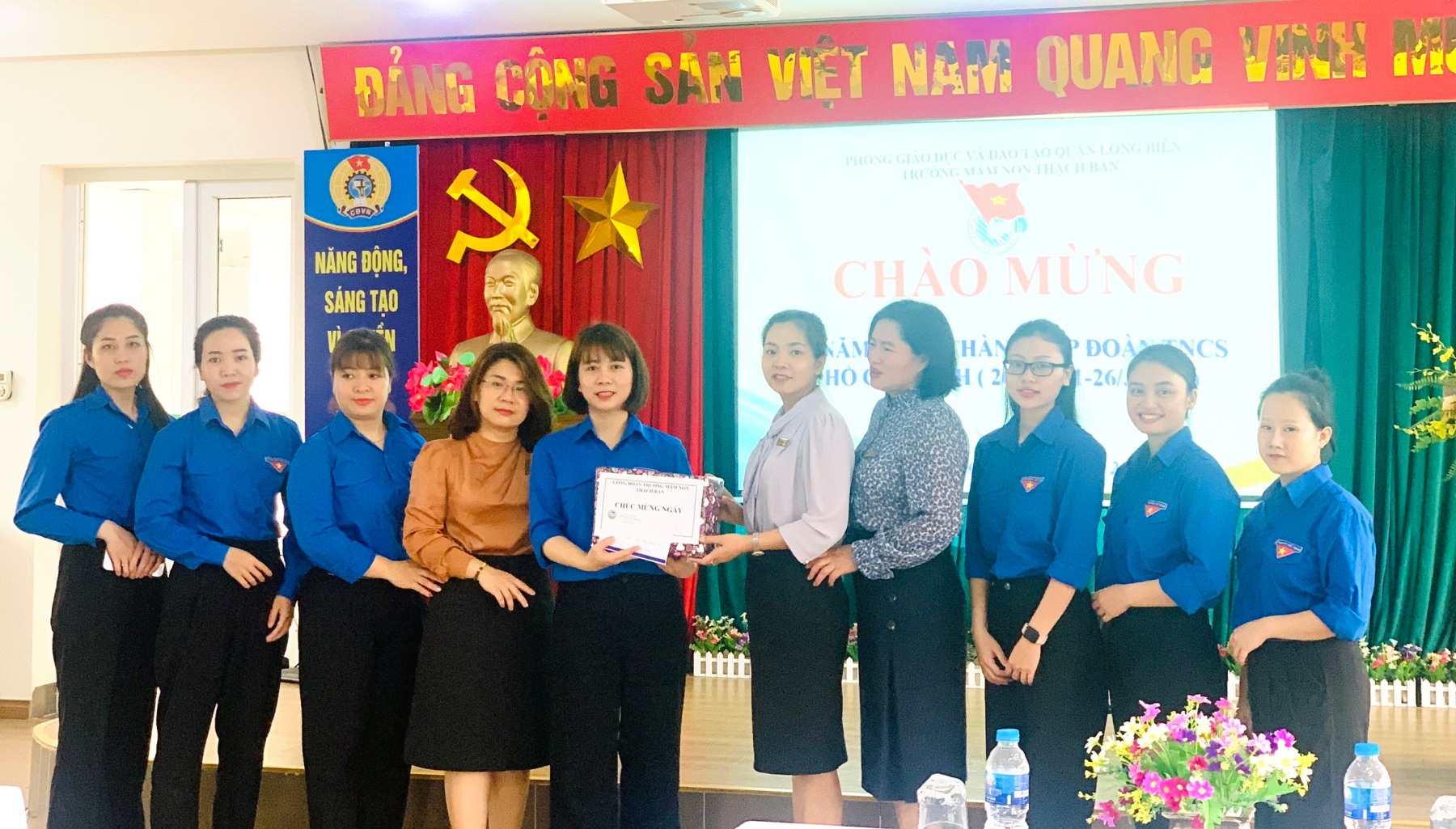 Ngày 24/3, trường mầm non Thạch Bàn tổ chức kỷ niệm 92 năm ngày truyền thống vẻ vang của Đoàn Thanh niên cộng sản Hồ Chí Minh (26/3/1931 – 26/3/2023). Tặng hoa chúc mừng buổi lễ có các đồng chí Hoàng Thị Nghĩa – Bí thư chi bộ - Hiệu trưởng nhà trường, đồng chí Lê Thị Bích Huyền – Phó bí thư chi bộ - Phó hiệu trưởng, đồng chí Nguyễn Thúy Hạnh – Chủ tịch công đoàn – Phó hiệu trưởng, cùng các đồng chí trong BCH Công đoàn trường mầm non Thạch Bàn.