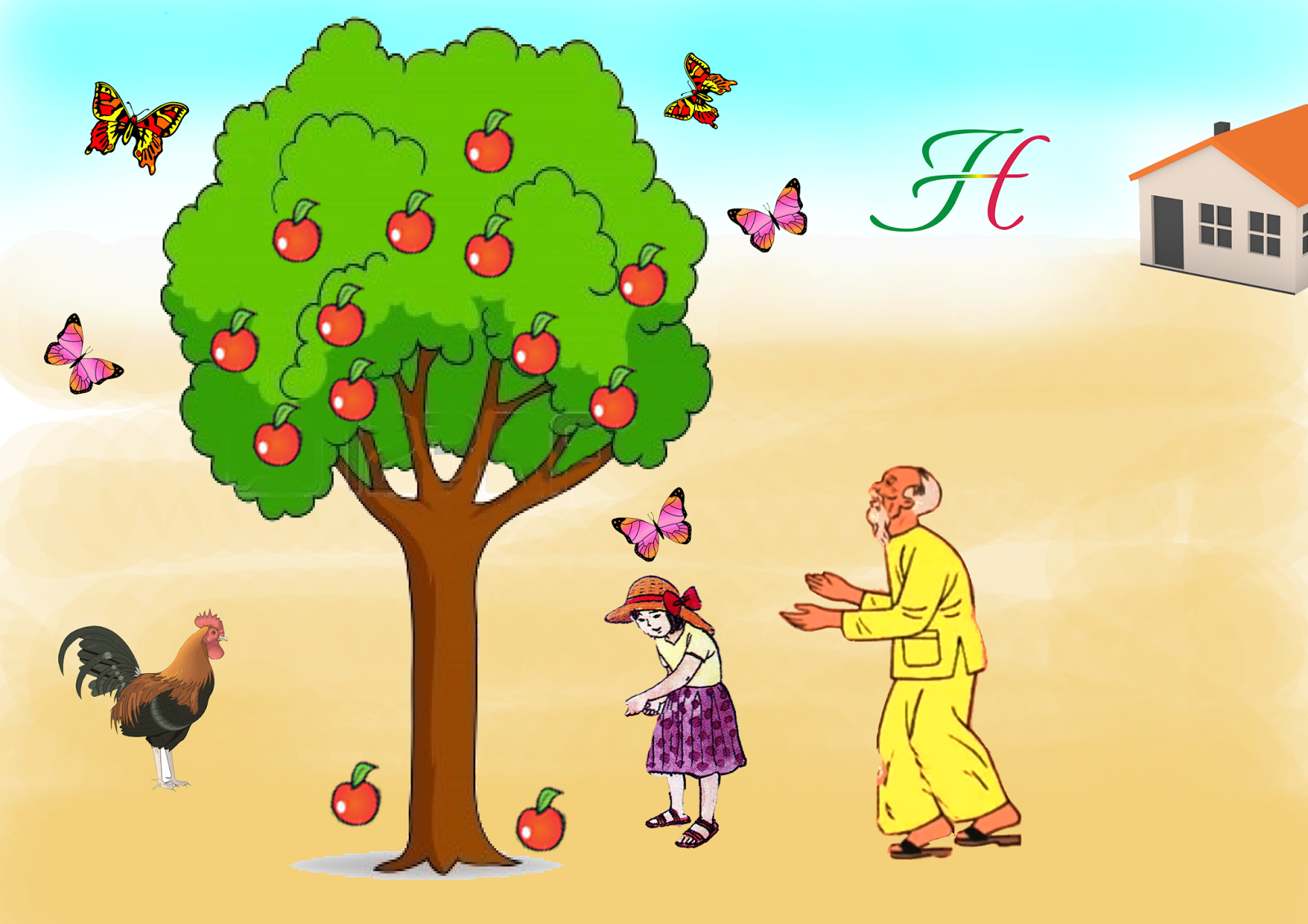 ngon lành hiện ra. Bé giơ áo ra, những quả táo chín ngon lành rơi vào lòng bé.