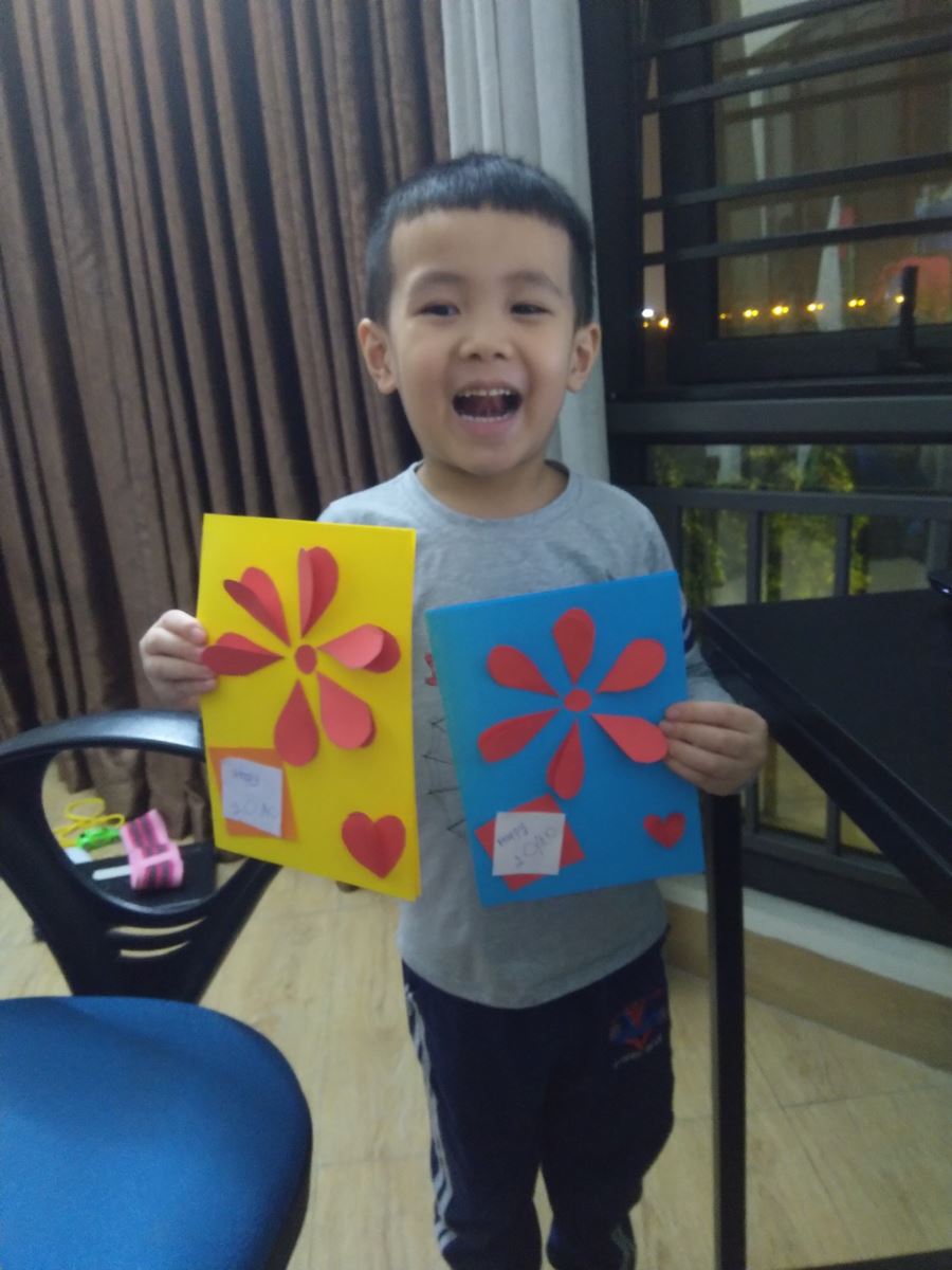 Mặc dù, không được gặp gỡ trực tiếp với cô, với bạn nhưng các con vẫn vui vẻ,vì được học biết bao kiến thức và kỹ năng mới hàng ngày thông qua video, các bài tập kỹ năng, đường link cô giáo gửi. Hầu như ngày nào con cũng có hoạt động hoặc bài học mới như: Tô màu, vẽ tranh, gấp thủ công; tập thể dục, múa hát hay những kỹ năng phòng chống dịch (rửa tay, đeo khẩu trang đúng cách..), các con rất háo hức nhờ bố mẹ hướng dẫn thực hành để chụp ảnh gửi lại cho cô. Yêu làm sao khi mà được xem những video, những hình ảnh các con gửi để khoe mình đã hoàn thành bài cô giao.