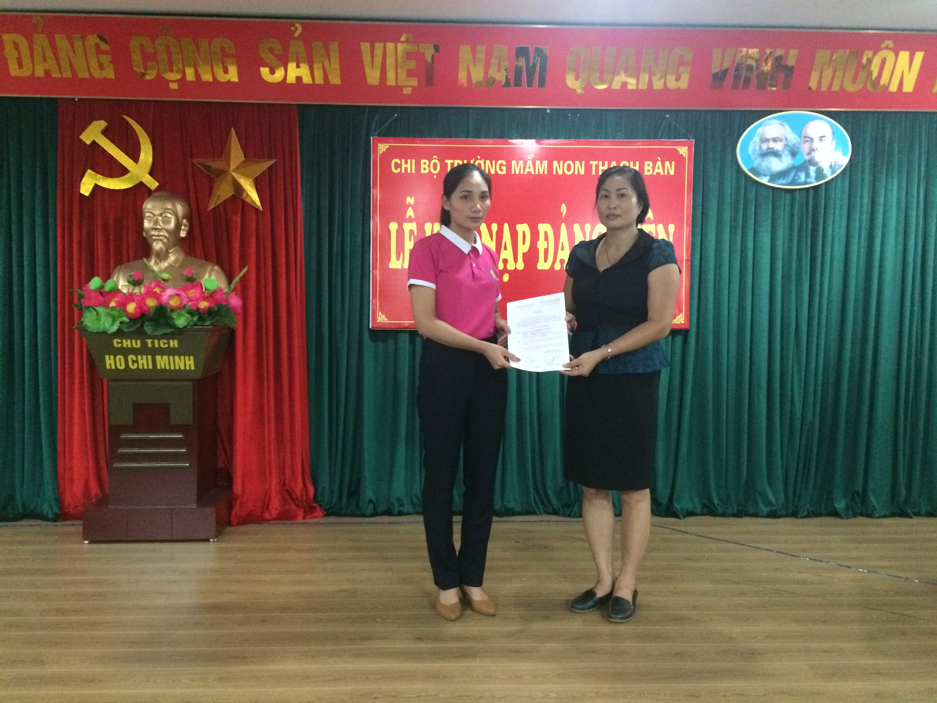 Sinh thời Chủ tịch Hồ Chí Minh đã khẳng định: “Vấn đề phát triển Đảng viên là vấn đề quan trọng trong xây dựng Đảng. Đảng phải có một số lượng đảng viên nhất định mới hình thành nên tổ chức đảng. Sự nghiệp lãnh đạo cách mạng của Đảng là sự nghiệp vĩ đại lâu dài phải do nhiều thế hệ chiến sĩ cộng sản tham gia gánh vác. Năng lực lãnh đạo và sức chiến đấu chỉ có thể có trên cơ sở số lượng, chất lượng đội ngũ đảng viên tương ứng. Do đó, Đảng phải thường xuyên làm tốt công tác phát triển đảng”. để áp dụng, học tập làm tốt vấn đề phát triển đảng viên Chủ tịch Hồ Chí Minh đã khẳng định. Hôm nay ngày 10/10/2016, trong không khí vui mừng phấn khởi của nhân dân cả nước nói chung và nhân dân Thủ đô Hà Nội nói riêng cùng nhau thi đua lập thành tích kỷ niệm 62 măm ngày giải phóng thủ đô(10/10/1954-10/10/2016), kỷ niệm 86 năm thành lập Hội liên hiệp phụ nữ Việt Nam (20/10/1930-20/10/2016) chi bộ trường mầm non Thạch Bàn long trọng tổ chức lễ kết nạp Đảng viên cho Nguyễn Thị Thu Hương theo quyết định ban hành của thường vụ Quận Ủy Long Biên. Lễ kết nạp đảng viên mới được diễn ra trong không khí trang nghiêm, đúng trình tự, thủ tục của Điều lệ Đảng, thay mặt chi ủy chi bộ của trường, đồng chí Nguyễn Thị Nghi Hương – Bí thư chi bộ đã trao Quyết định kết nạp Đảng, căn dặn đảng viên mới tích cực rèn luyện, nâng cao năng lực chuyên môn, phẩm chất chính trị, đạo đức Cách mạng, thực hiện đúng trách nhiệm và nghĩa vụ của người đảng viên Đảng Cộng sản Việt Nam. góp phần xây dựng chi bộ trong sạch, vững mạnh, đặc biệt là thực hiện tốt quy định về những điều Đảng viên không được làm.