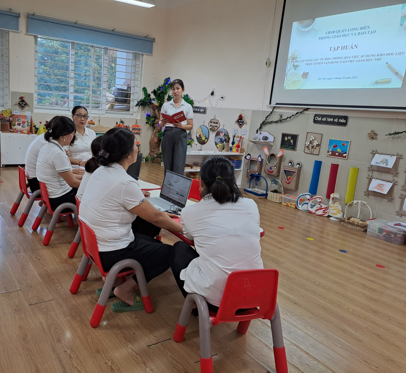 Không ngừng học tập và nâng cao nhận thức về vai trò và ý nghĩa cần thiết của việc học tập suốt đời, xây dựng xã hội học tập, chiều ngày 05/10/2023 khối Nhà trẻ trường Mầm non Thạch Bàn đã có buổi tập sinh hoạt chuyên môn với nội dung “Nâng cao năng lực tự học thông qua việc sử dụng kho học liệu trực tuyến vận dụng vào việc giáo dục trẻ”.