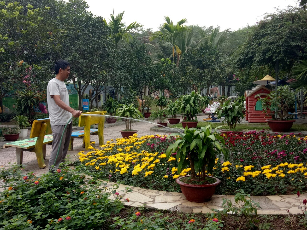 Ngoài ra, những đồ chơi ở sân trường như: đu quay, bập bênh, cầu trượt, nhà leo núi, đu treo sàn lắc… bác thường xuyên kiểm tra lại xem có an toàn cho các cháu chơi hay không? Nếu thấy đồ chơi đó có nguy cơ gây mất an toàn bác đều báo cáo Ban giám hiệu để có phương án sửa chữa kịp thời. Mặt khác, để đảm bảo an toàn cho trẻ ở mọi lúc, mọi nơi những hôm trời mưa dù chỉ là vũng nước đọng nhỏ bác cũng quét để tránh các cháu chạy bị trượt chân, bị ướt, bị ngã.
