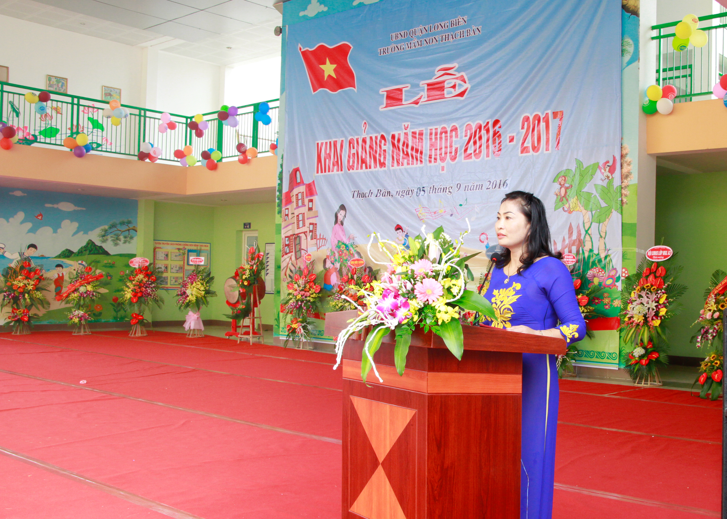 Cũng tại buổi lễ, đ/c Đoàn Anh Thư – Phó bí thư thường trực đảng ủy phường Thạch Bàn- đại diện lãnh đạo Đảng, chính quyền địa phương đã lên tặng hoa chúc mừng cô và trò nhà trường, tặng quà cho trẻ em có hoàn cảnh khó khăn. Sự quan tâm sát sao của các đồng chí lãnh đạo là niềm động viên lớn lao cho tập thể nhà trường quyết tâm thực hiện tốt các phong trào thi đua, tiếp tục giành những thắng lợi mới trong sự nghiệp chăm sóc- giáo dục trẻ