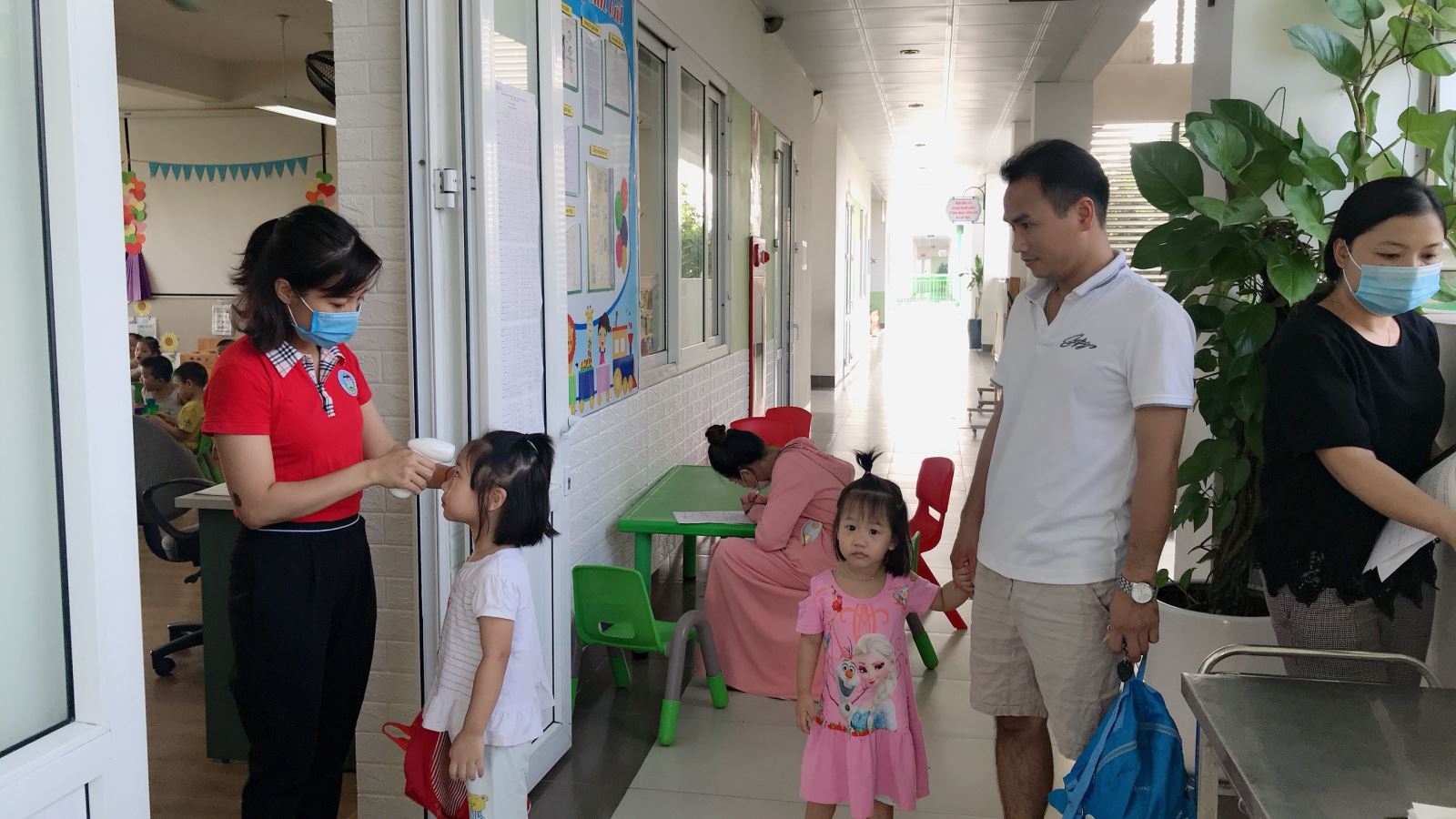 Dưới sự chỉ đạo sát sao của Ban giám hiệu nhà trường, các đồng chí GV- NV nhà trường đã thực hiện nghiêm chỉnh và có hiệu quả phương án đón trẻ được chuẩn bị trước đó. Toàn bộ các lớp học và phòng chức năng, khu hoạt động của trẻ được vệ sinh sạch sẽ, mở cửa thông thoáng, nước rửa tay khô, dụng cụ đo thân nhiệt điện tử đã được chuẩn bị sẵn. Tại cửa lớp, các cô giáo hỏi thăm sức khỏe, đo thân nhiệt cho trẻ, ghi nhiệt độ vào sổ theo dõi sức khỏe và hướng dẫn phụ huynh khai báo y tế theo quy định.