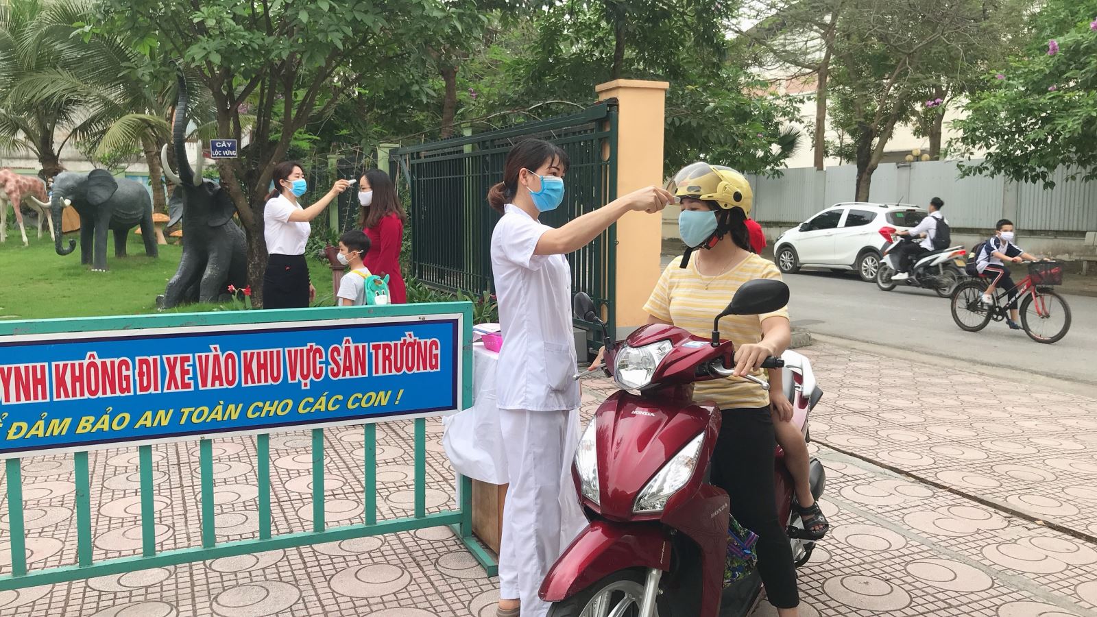 Triển khai phương án, nhà trường đã phân luồng đo thân nhiệt phụ huynh ngay từ lối vào cổng chính để tránh tình trạng ùn tắc và tập trung đông người. Nhà trường yêu cầu phụ huynh có đủ điều kiện sức khỏe mới được đưa con lên lớp. Giáo viên chủ nhiệm thực hiện đo thân nhiệt cho trẻ tại cửa lớp và ghi nhiệt độ vào sổ theo dõi sức khỏe trẻ có chữ kí xác nhận của phụ huynh.