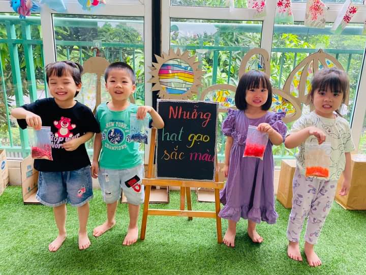 các bạn nhỏ lớp MGN B2 làm thí nghiệm hạt gạo đổi màu