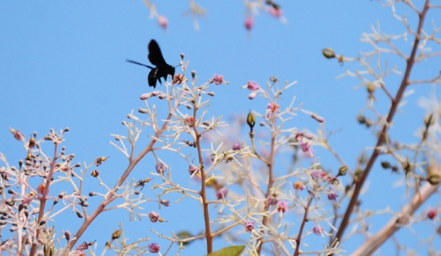 Một thời gian sau, cây trổ hoa. Hoa có màu đỏ tươi, năm cánh nhỏ xíu và túm tụm vào nhau nhìn xa như những vết máu đỏ li ti… Mọi người gọi loài hoa ấy là hoa ngô đồng.